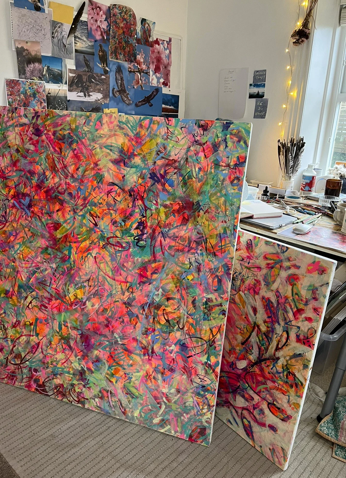 I work in layers of colour, shape, pattern, brush mark and line, to create highly expressive, semi-abstract, florals and landscapes which, I hope, evoke a sense of freedom, fun, hope and inspiration.